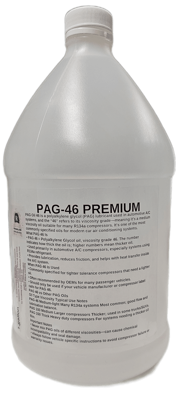 PAG Oil 46 is a polyalkylene glycol (PAG) lubricant used in automotive A/C systems, and the “46” refers to its viscosity grade—meaning it’s a medium‑viscosity oil suitable for many R134a compressors. It’s one of the most commonly specified oils for modern car air‑conditioning systems.