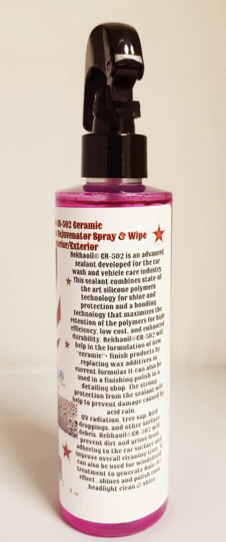 UV radiation, tree sap, bird droppings, and other surface debris. Rekhaoil®CR-502 will prevent dirt and grime from adhering to the car surface and improve overall cleaning time. It can also be used for windshield treatment to generate Rain-X® effect or used as a tire dressing, headlight clean & shine 8. oz spray bottle